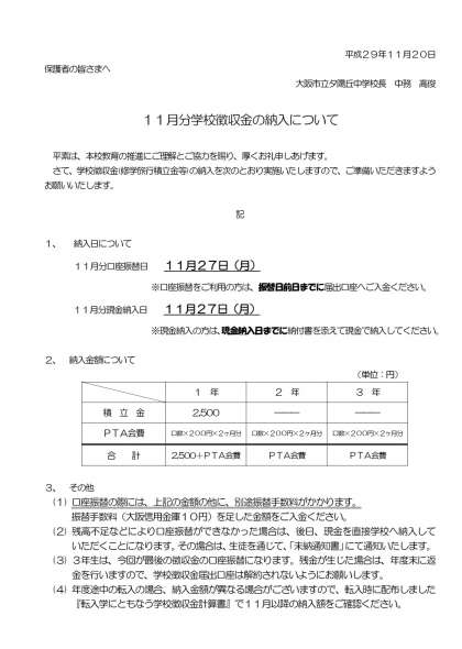本日、お子さまを通じて「11月分学校徴収金の納入について」を保護者の皆さまへ配布しております。