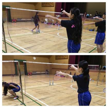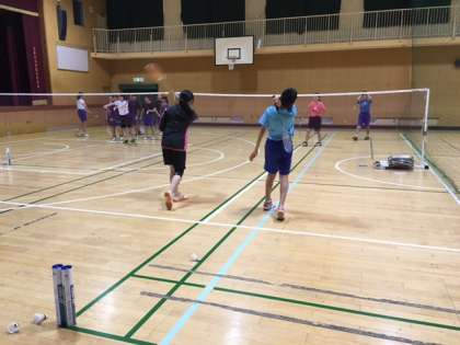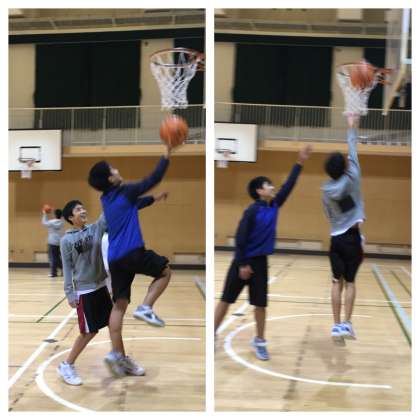 体育館では男子バスケ部とバドミントン部が基礎練習を中心に部活動に励んでいます。