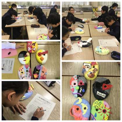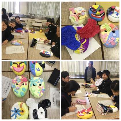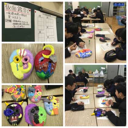 班のメンバーの完成したお面を見て、友達の良いところを見つけ、思ったことをプリントに書いていきました。