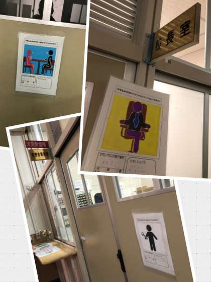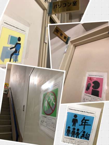 1年生美術で作成したピクトグラムのデザインが実際の場所に掲示されています。