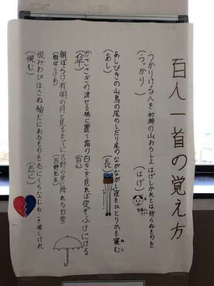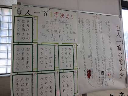 2年生のフロアには国語係が作成した百人一首の覚え方が掲示されています。