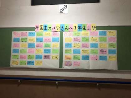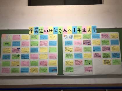 1年生が国語の授業を使って作成した、3年生へのはなむけの言葉を綴ったメッセージカードが、東階段に掲示されています。