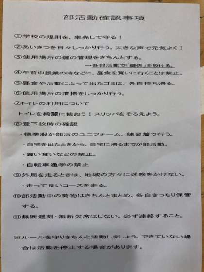 学校での規則をしっかり守り、気持ちよく部活動に参加するようにしましょう。