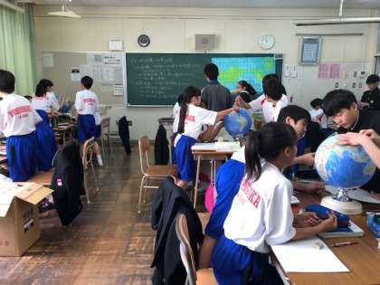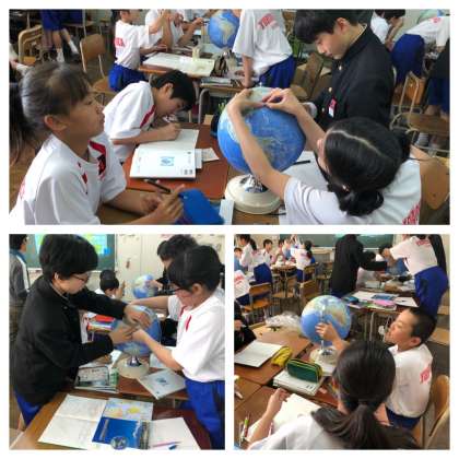 班に一つ地球儀を準備し、世界地図では地球の姿を正しく表すことが出来ていない点について学習しました。
