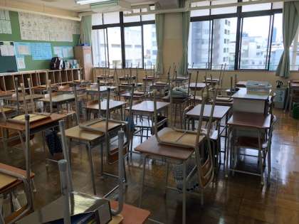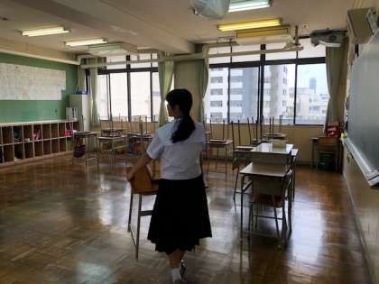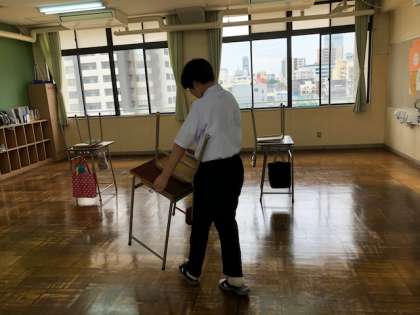 朝早く来た人たちが自分の机だけでなく、クラスみんなの机を教室へ入れてくれています。