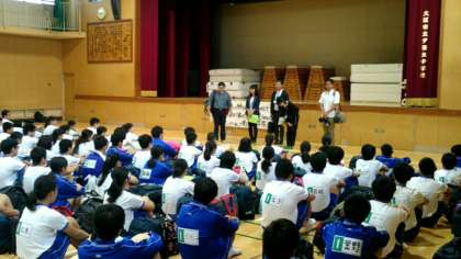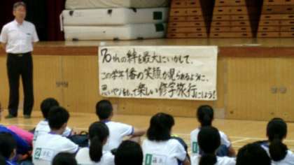修学旅行委員長のあいさつが終わり、今回の修学旅行に一緒に行ってくださる、旅行会社の方、写真屋さんの紹介がありました。