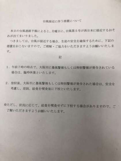 2.登校後、大阪市に暴風警報もしくは特別警報が発令された場合は、安全を考慮し、原則、給食を喫食後に下校といたします。