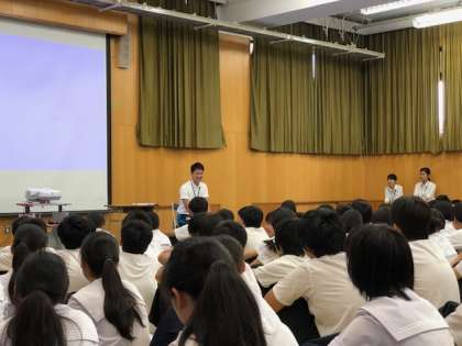 教育実習生からのお話がありました。 自分自身の経験から、感じた事や学んだ事について話をしてくれました。 皆、実習生の話に耳を傾け、聞き入っていました。 それぞれの人生、それぞれの生き方があります。 十人十色。 君たちはどう生きるか。