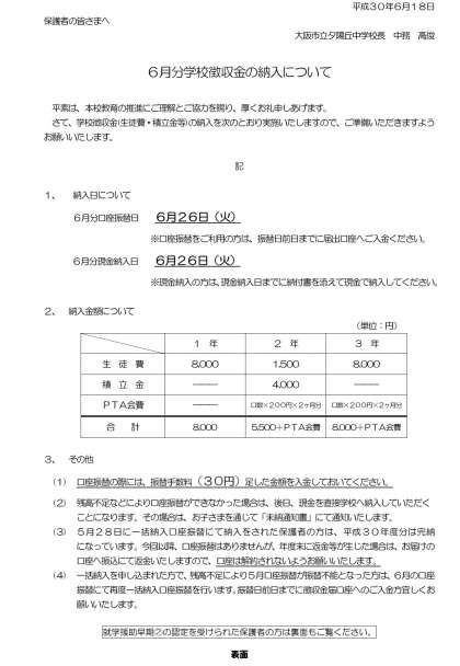 昨日、お子さまを通じて「6月分学校徴収金の口座振替について」を保護者の皆様へ配布しております。