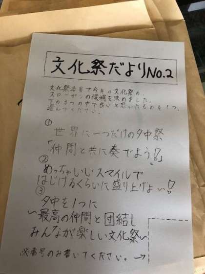 以前文化祭のスローガンを募集し、その中から文化祭実行委員が選び、組み合わせ、3つの候補に絞られました。