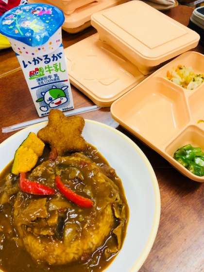 カレールウに揚げ夏野菜、星形コロッケ、塩茹でしたオクラをのせていただきました。