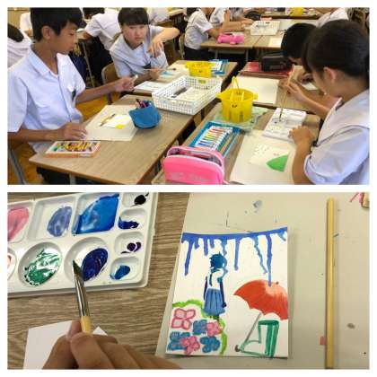 前回学習した様々な技法を使って、『わたしの好きな季節』をテーマに作品を作っています。