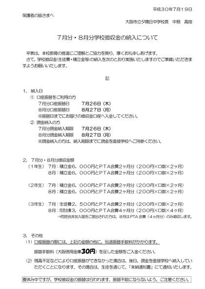 夏休み中ですが、学校徴収金の振替は行われます。振替不能にならないよう、ご注意ください。