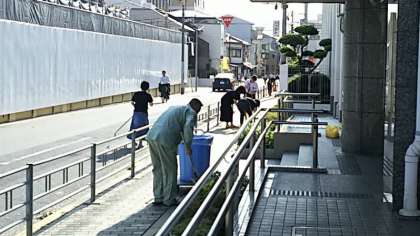 朝から学校周辺の落ち葉などを先生たちや生徒会の人たちが掃除をしました。
