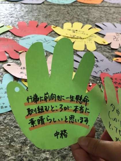 手形に切り取られた画用紙に一人一人が『クラスの良いところ』について書きました。