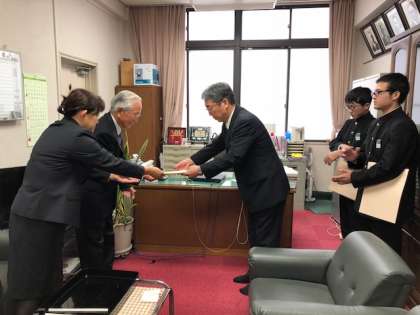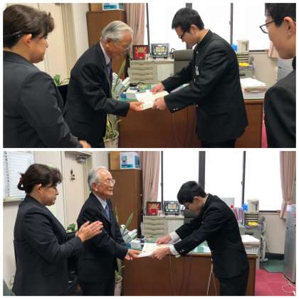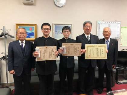 夕中から3年生2名が納税貯蓄組合連合会より『税についての作文』の表彰を受けました。