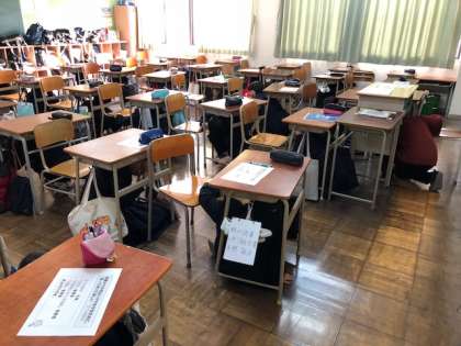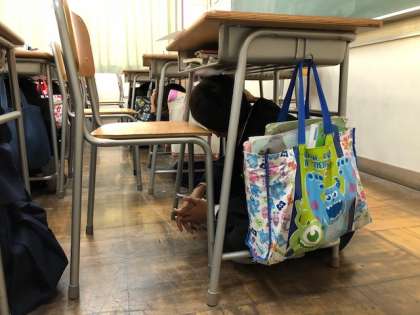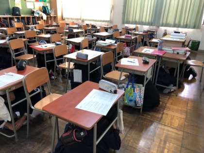 緊急放送後、出口を確保し、次の放送が入るまで各自素早く机の下に避難しました。