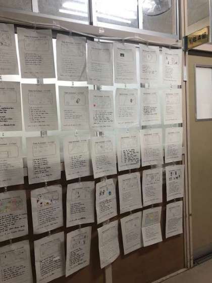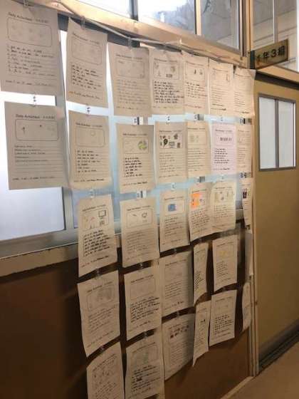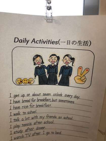 1年生の教室の前には、英語の授業で作成したDaily Activitiesの英作文が掲示されています。