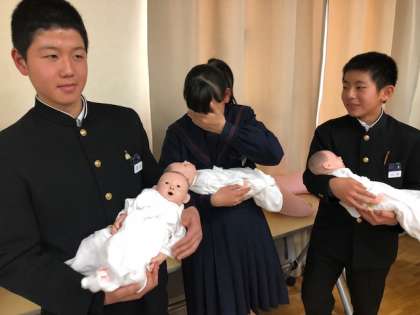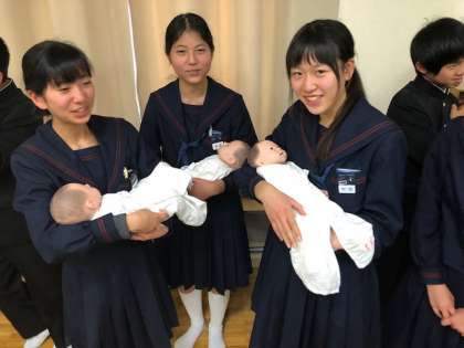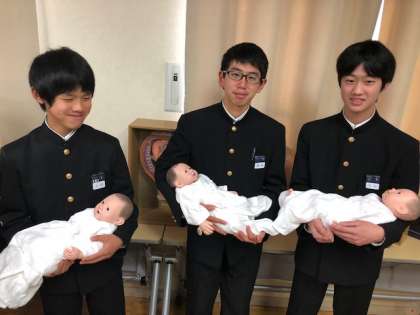 その後体験学習として、新生児室の赤ちゃん見学、胎盤に触れてみよう、妊婦体験、新生児人形抱っこ体験をさせていただきました。