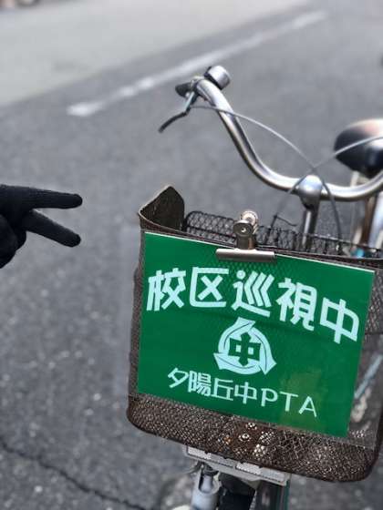 多くのPTA地域校外委員の皆様と共に、子どもたちの安全を見守るために、桃陽、五条、生魂の3地域に分かれて自転車で回りました。