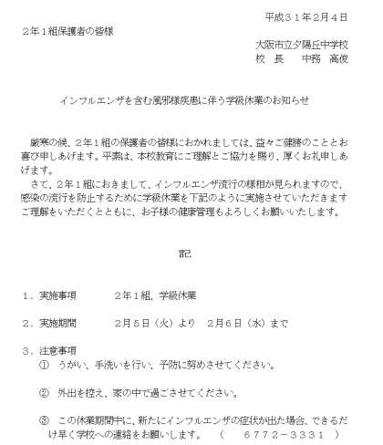 2年1組におきまして、インフルエンザ流行の様相が見られますので、学級休業を下記のように実施させていただきます。