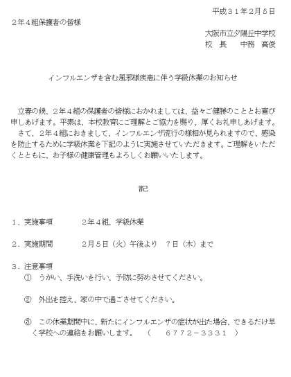 2年4組におきまして、インフルエンザ流行の様相が見られますので、感染を防止するために学級休業を下記のように実施させていただきます。