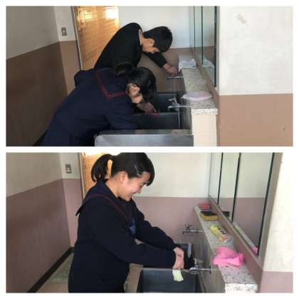 美化委員会、保健委員会の様子です。 トイレや手洗い場、廊下などの清掃活動をしています。