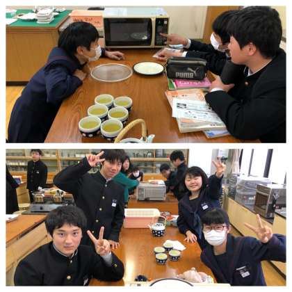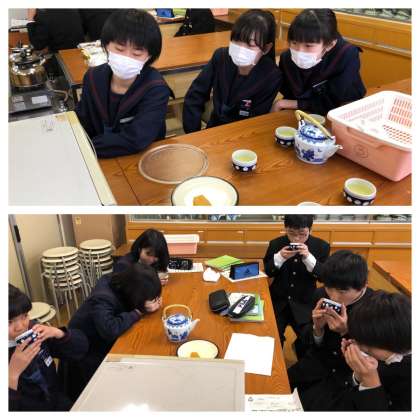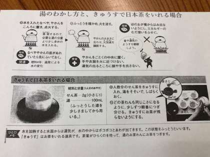 湯の沸かし方、きゅうすを使ったお茶の入れ方、電子レンジを使って美味しく温める方法について学習しました。