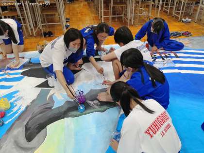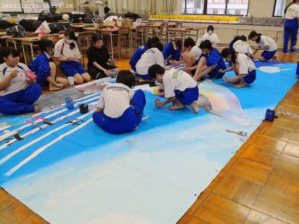 文化祭の舞台発表を彩るために背景画を制作しています。この作品は全学年美術科の夏休みの宿題がはられるので、全校生徒の共同制作となります。文化祭当日まで楽しみにしておいてください。