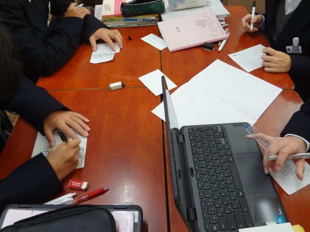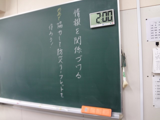 1年生の国語の授業では、タブレットを使って調べたり、班で話し合ったりしながら、防災新聞を作っていました。