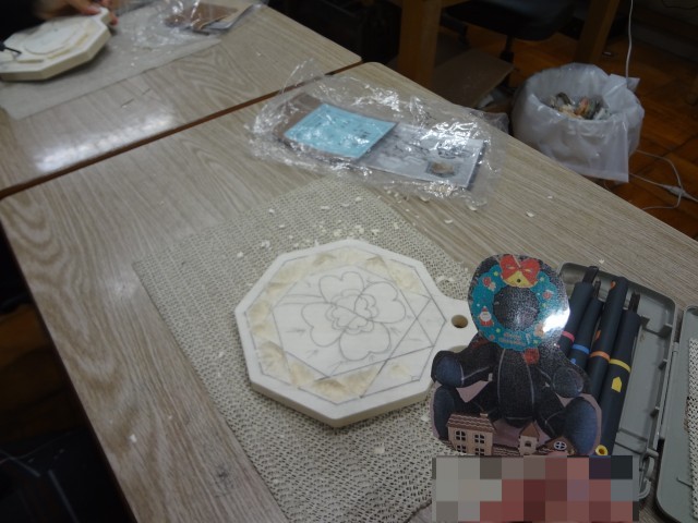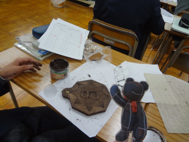 2年生の美術の授業です。鍋敷きに彫刻刀で自分がデザインしたものを彫っています。