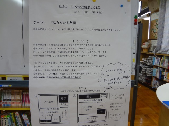 「私たちの3年間」というテーマで、新聞記事をスクラップし、その時期の夕陽丘中学校の行事とともに3年間の社会の動きを振り返るという取り組みをしていました。