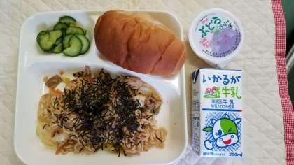本日は、焼きそば、きゅうりのしょうがづけ、ぶどうゼリー、パン、牛乳です。