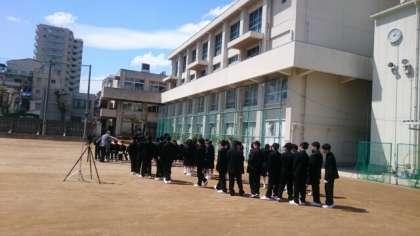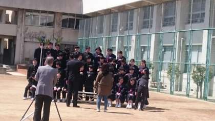 あたたかな春の陽射しが注ぐ中、学級写真を撮影しました。新しいクラスになって最初の写真撮影です。生徒の皆さんは、お互いに服装などを確かめあいながら、クラスごとに撮影にのぞみます。ニッコリ笑顔で写ることができましたか?