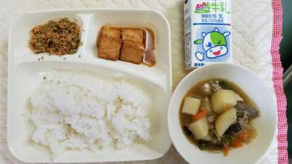本日の献立は、鶏肉とジャガイモの煮物、厚揚げのしょうゆだれかけ、紅さけそぼろ、ごはん、牛乳です。