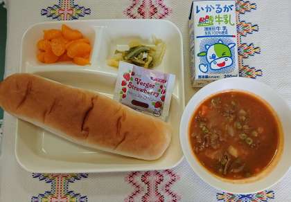 本日の献立は、ビーフシチュー、キャベツのピクルス、みかん、コッペパン、牛乳です。
