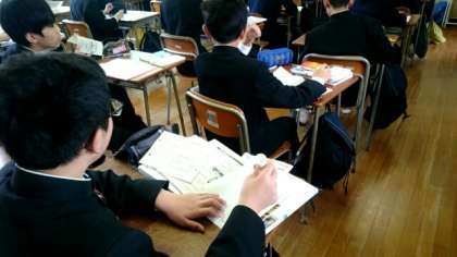 2年生で「理科(化学)」の授業が行われています。「水溶液と物質の取り出し方」について、プリント、映像を使って学習します。映像を見ながら説明を聞くと、たいへんわかりやすいですね。生徒の皆さんは、配付されたプリントをしっかりとノートに貼って、学習にのぞんでいました。