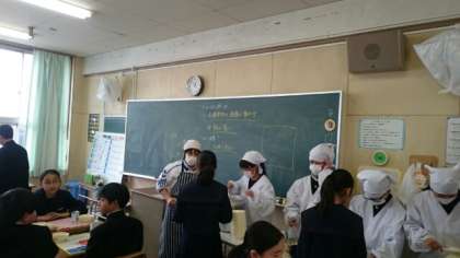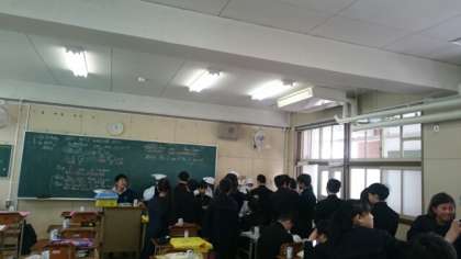 4時間目の授業が終わり、「給食」の準備に大忙しです。1年生の皆さんが、クラスメイトのご飯をよそっています。小学校の経験しているので、スムーズにすすみます。全員分の配食が終わったら、お楽しみのお昼ご飯!たっぷり食べて、午後からの授業もがんばりましょう。