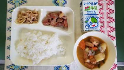 本日の献立は、鶏肉のてりやき、じゃがいもと厚揚げの煮物、ごまかかいため、ごはん、牛乳です。