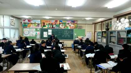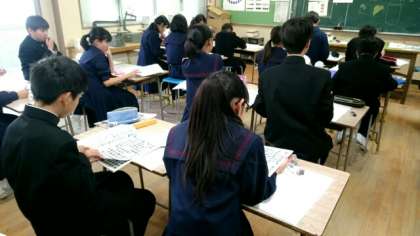 1年生の皆さんが美術「レタリング」の授業を受けています。体操服に付ける「ゼッケン」を自らの手で美しく仕上げます。レタリング字典とにらめっこしながら、ゴシック体で下書き中。近くの友達に「これで良いかな?」と尋ねながら、熱心にペンをすべらせていました。完成が楽しみです!