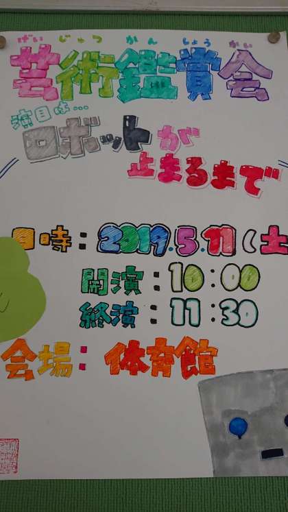 明日は、芸術鑑賞(土曜授業)です。生徒の皆さんの登校時間は、9:00から9:25です。開演は10:00、閉演は11:30の予定です。保護者の皆さまも、ぜひ、ご観覧ください。