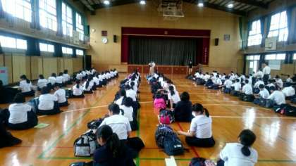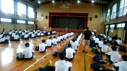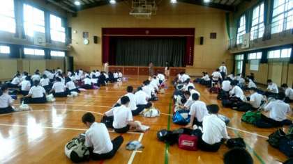 明日5月15日(水)から17日(金)の3日間、3年生が長崎への修学旅行に出かけます。現在、体育館にて修学旅行の事前指導の真最中。各自のカバンにネームタッグを取り付けたり、持ち物を確認したりなど、忘れ物などのうっかりミスが無いよう、お互いに注意します。