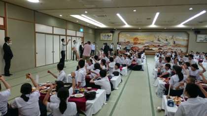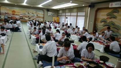 入館式の後は、お楽しみの夕食です。みんなで(お茶で)「乾杯」!