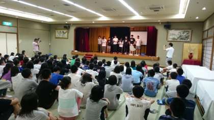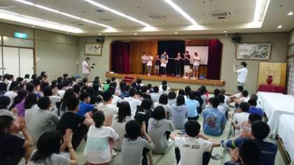 さぁ、夜のレクリエーションの始まりです。各クラスのレク係の皆さんが進行をつとめます。皆さんが工夫して考えたゲームで、大いに楽しみましょう!