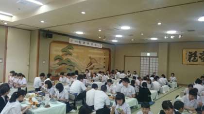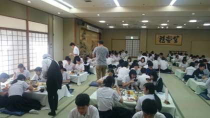 美味しい食事に話も弾みます。テーブル間でお皿をやりとりし、残さずにいただきます。