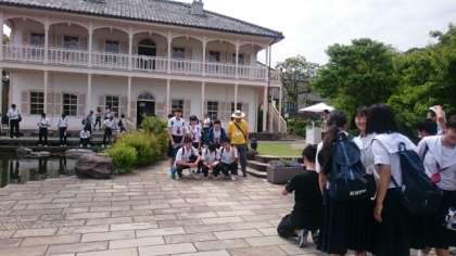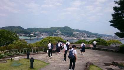グラバー園内を巡ります。洋館前で記念写真を撮影したり、長崎港を眺めたり、景観を楽しんでいます。