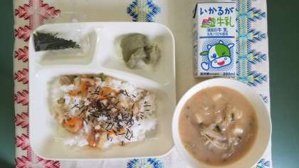 本日の献立は、かやくご飯、みそ汁、抹茶ういろう、え牛乳です。