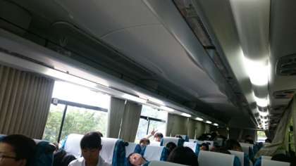 バスは高速を降りて一般道を進みます。山の新緑がまぶしく感じます。バスの中は今も充電中です。