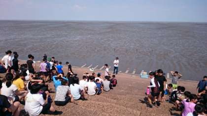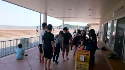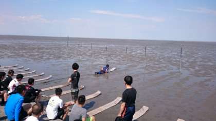 専用の足袋を履いて、いよいよ干潟に入ります。まずは「潟スキー」で干潟を進みます。