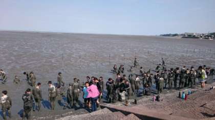 写真撮影の後は、干潟でのフリータイム。雪合戦ならぬ泥合戦に興じています。
